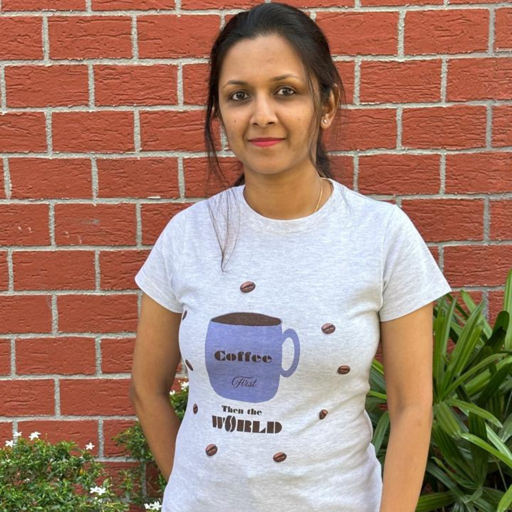Printed Ladies T-Shirt (Grey) - 'Coffee First then the World'