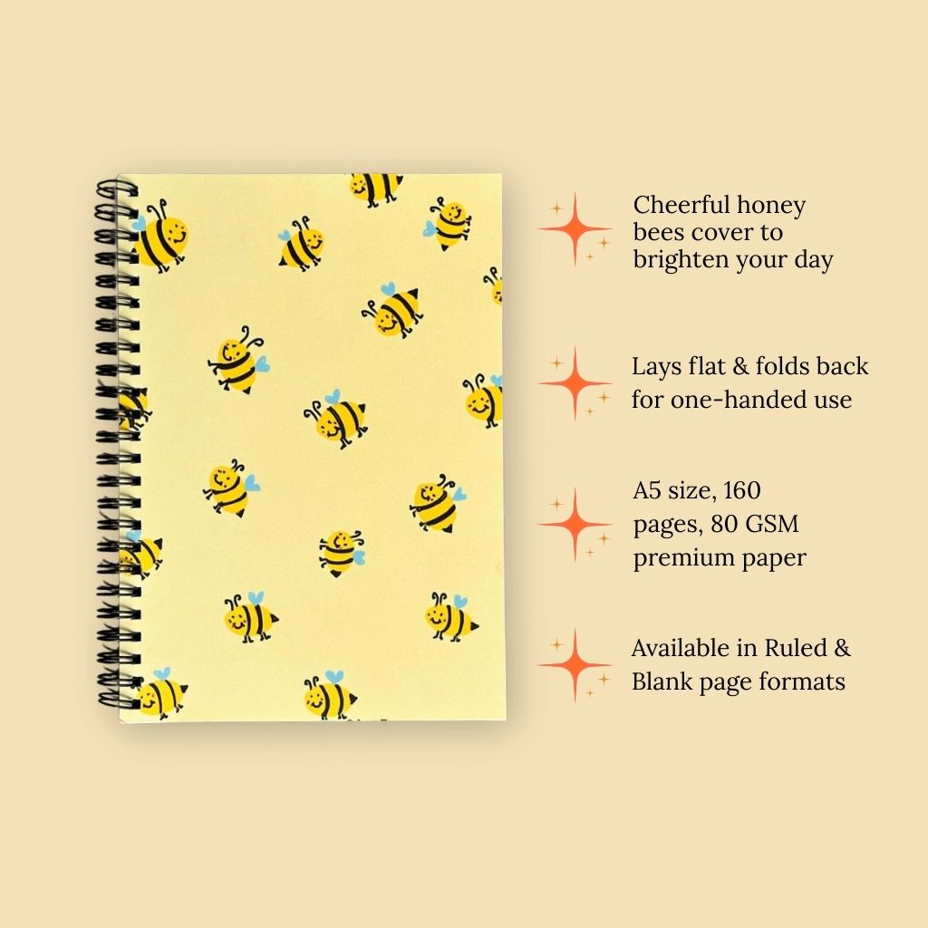 Brighten up your everyday note-taking with this cheerful spiral notebook. Designed for flexibility and ease, the sunny yellow 'Honey Bees' cover adds a joyful touch to your daily routine.