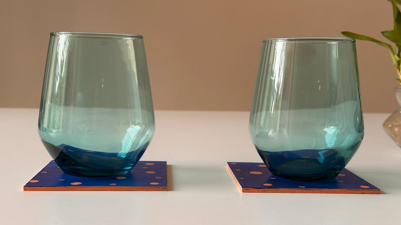 Add a celestial charm to your coffee table with our 'The Night Sky' hand painted coasters. This set of two square coasters captures the mystique of a starlit sky in blue and orange tones, combining functionality with artistry. Handcrafted through a detailed five-step painting process, these coasters not only protect your surfaces but also elevate your home aesthetic.