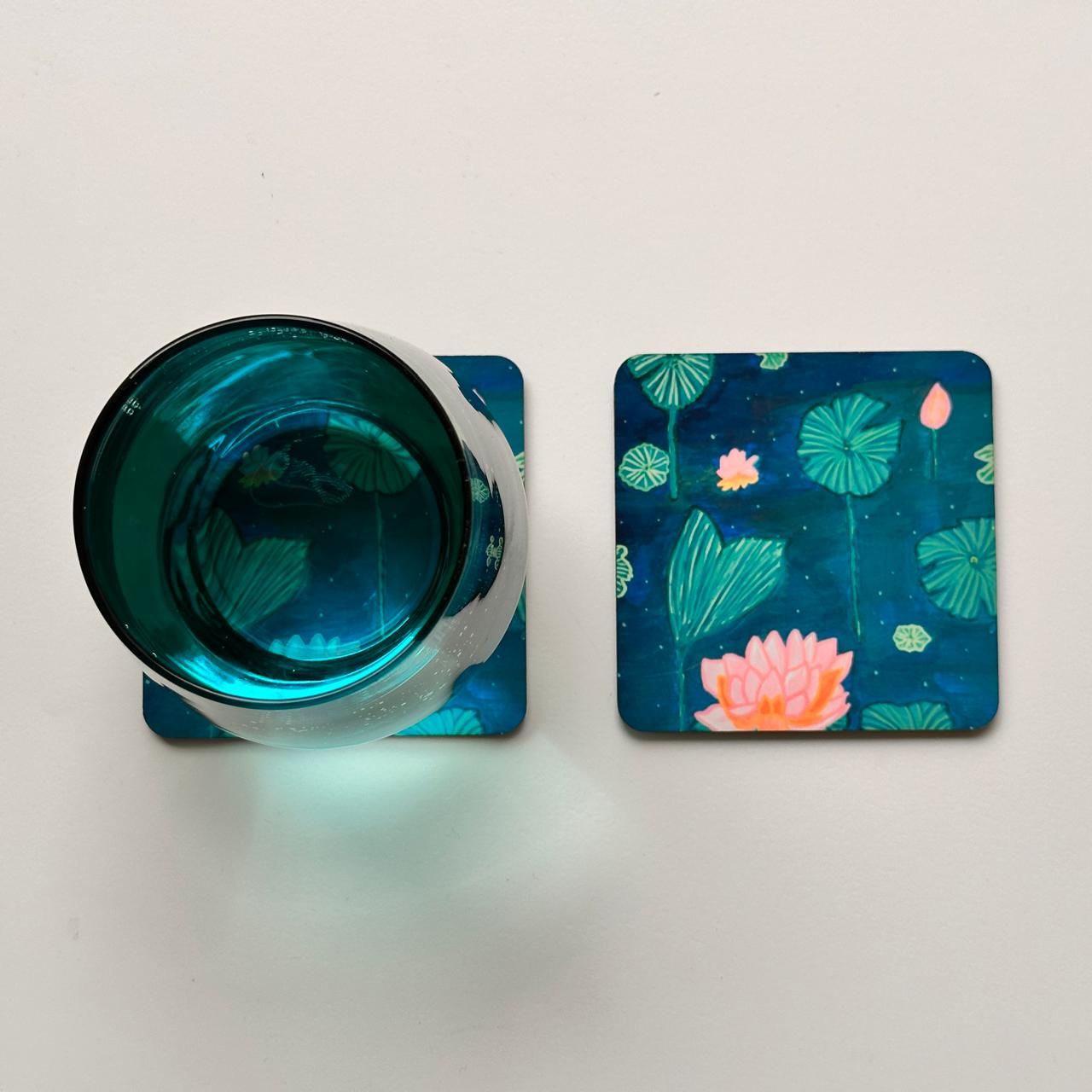 Bring a sense of serenity to your everyday rituals with this calming set of two coasters, inspired by the artwork A Moment of Calm. Soft pink lotus blooms rest gently on deep blue waters, radiating elegance, tranquility, and natural grace. Whether you're sipping morning chai or winding down in the evening, these coasters offer a gentle visual reminder to slow down and be present — and are sure to draw admiration from guests.