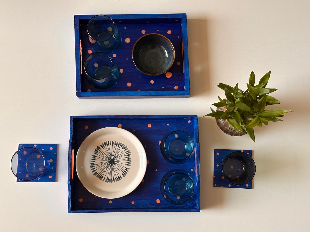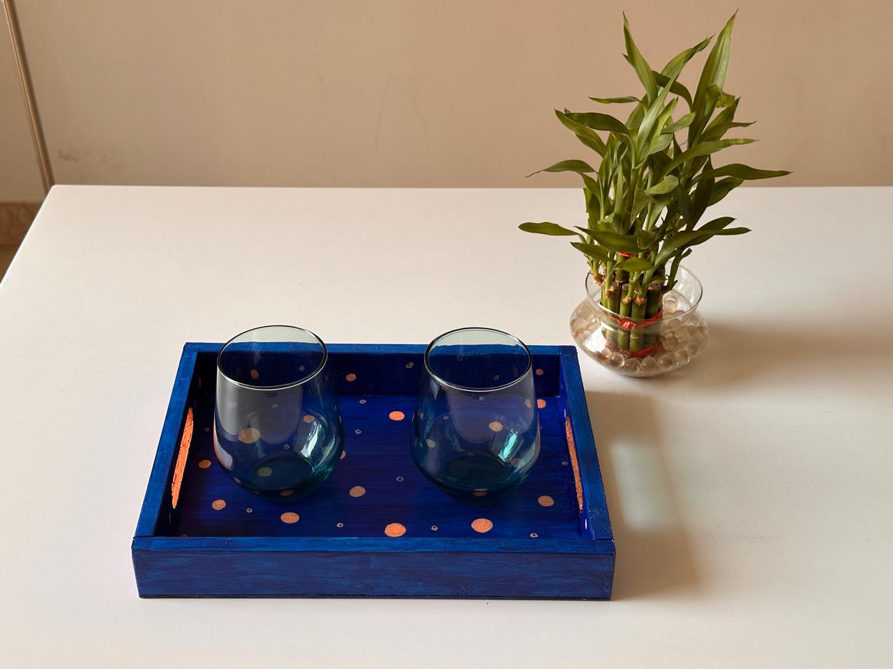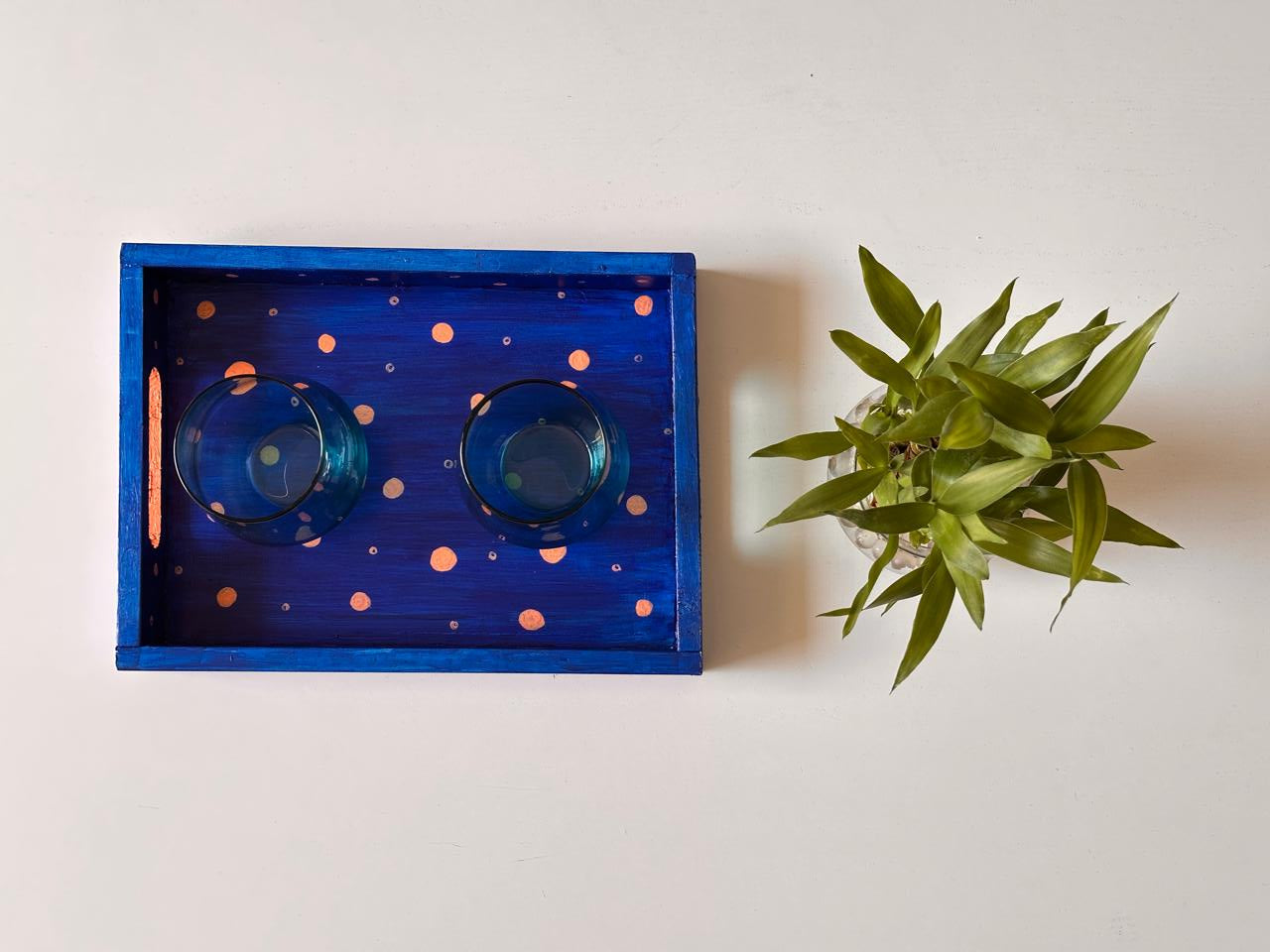 Hand painted tray made of high quality MDF wood, painted in a five step process. Can fit in a small quarter plate and two full size glasses.