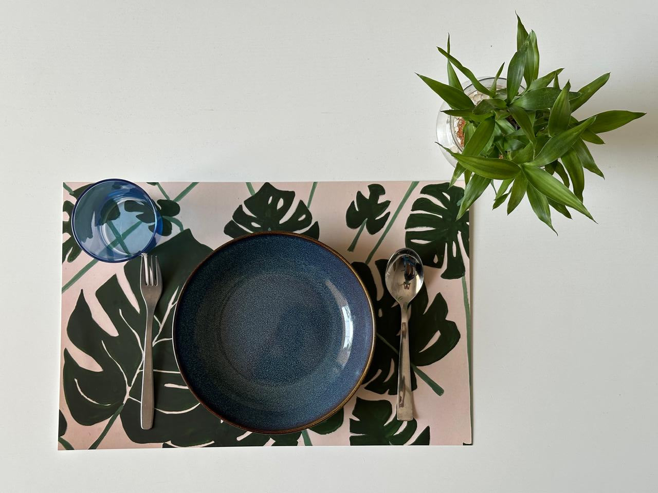 Refresh your dining setup with our 'Monstera Leaves' placemats, featuring a reprint of a hand painted artwork by our designer. The bold green leaves against a neutral backdrop add a breezy, nature-inspired elegance to any table. Whether you're hosting guests or enjoying a quiet meal, these mats protect your surface while elevating your aesthetic. A beautiful blend of practicality and design, perfect for everyday use or special occasions.