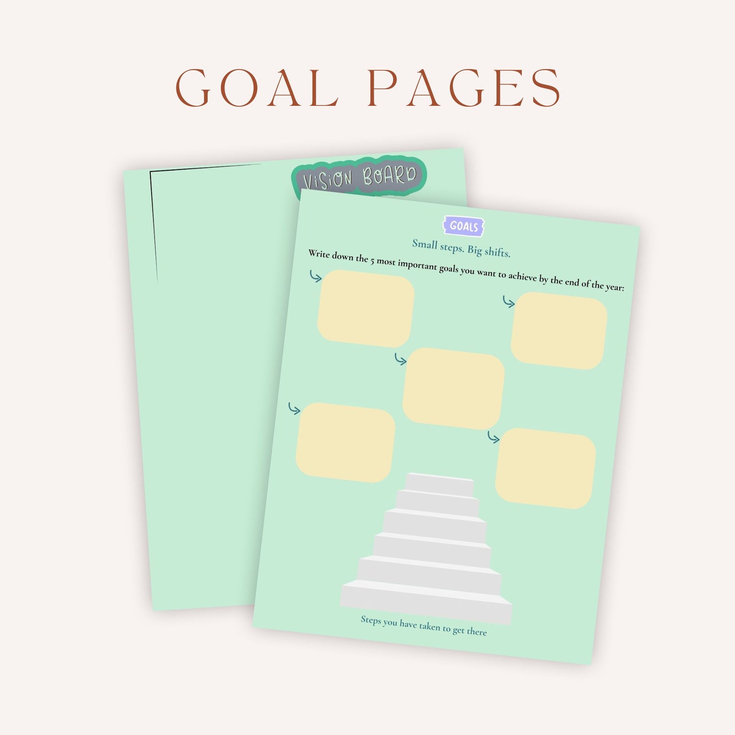 - Inside Pages: Guided journal prompts, goal planning tools, trackers, gratitude logs, reflection pages, and doodle spaces